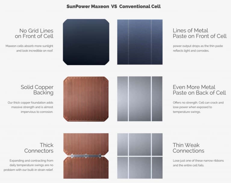 The 2017 introduced IBC cells have a grid of 30 or more conductors integrated into the rear side of the cell, unlike standard conventional cells which typically have 4 to 6 large visible ribbon busbars and multiple fingers on the front side of the cell. (see image below in the original post), The most obvious problem with the more common front exposed busbar design is they partially shade the cell and reflect some of the light photons which reduces efficiency, while IBC cells don’t suffer this problem and as a bonus look much ‘cleaner’ with no exposed busbars. Watch this video that shows the difference in the durability of a SunPower Maxeon Cell vs other IBC cells.