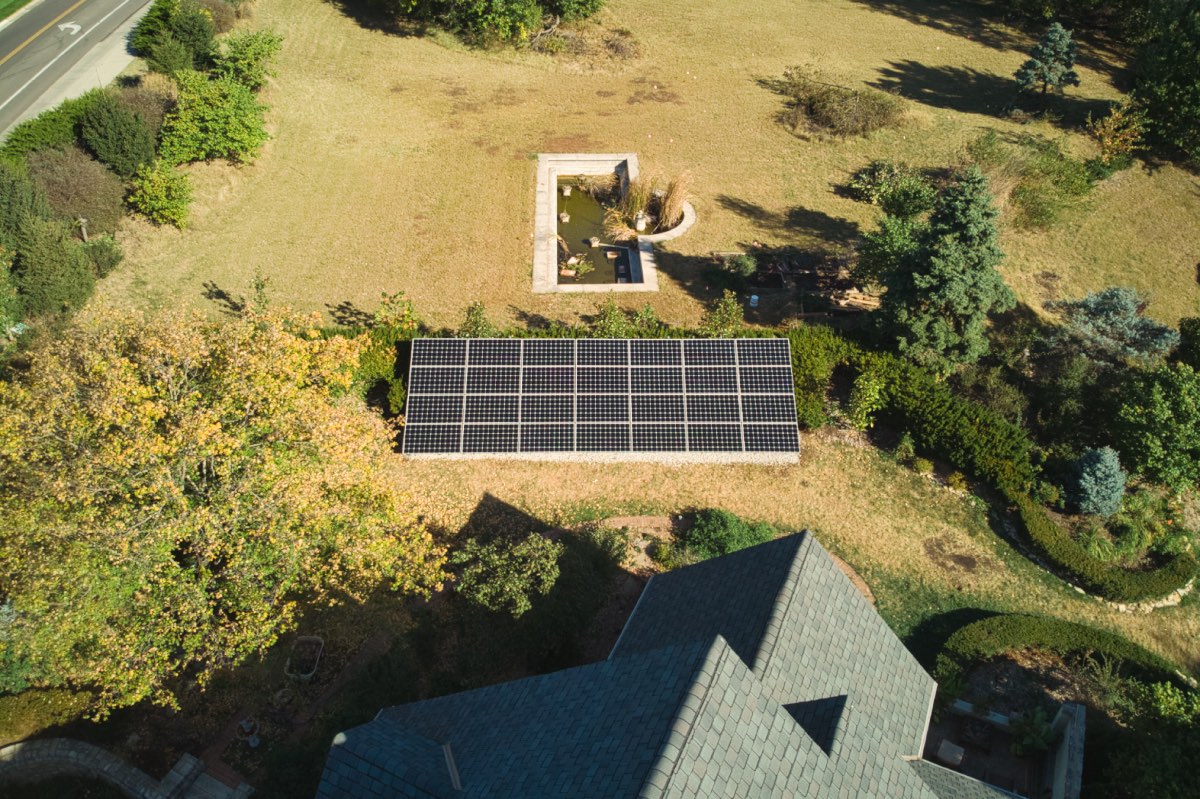 The solar installation sits on an open part of the owners’ property, facing towards the south. One of the features that distinguishes this ground mount from others we have designed is the line of bushes and vegetation that covers up the back of the installation. This Lawrence solar installation will produce clean, inexpensive, renewable power for the homeowners for decades to come.