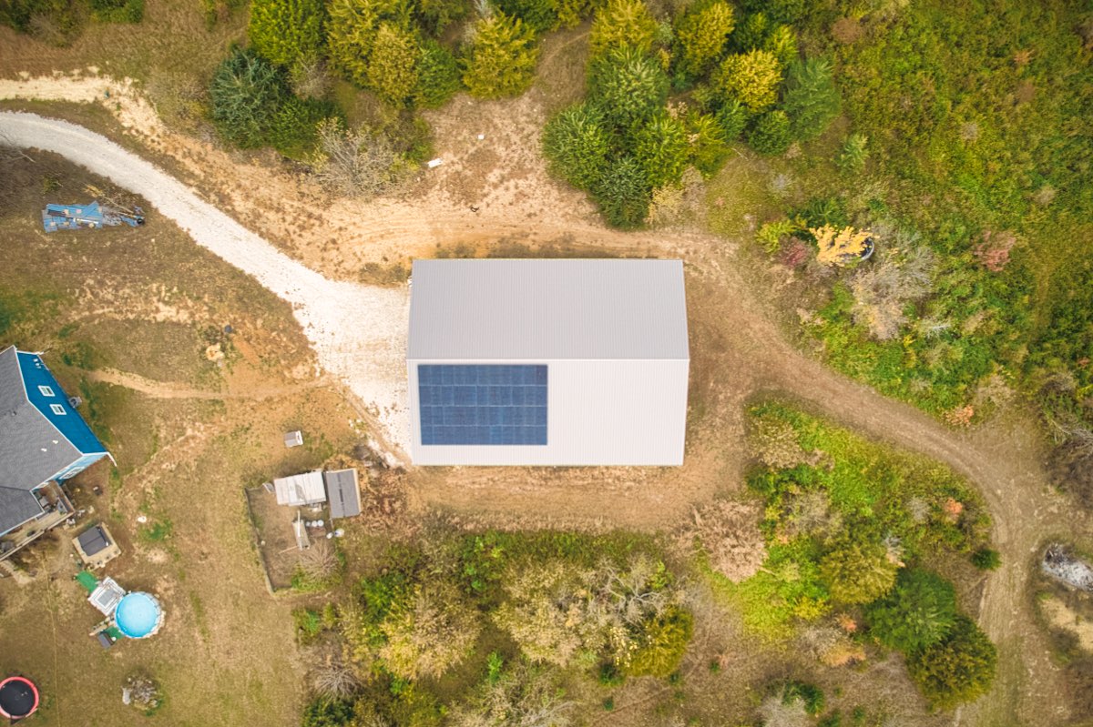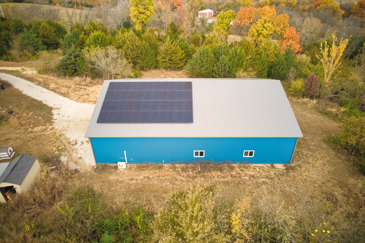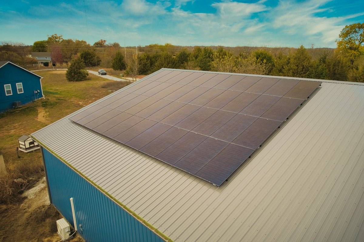 - 44 REC N-Peak solar panels mounted on a metal utility-building roof