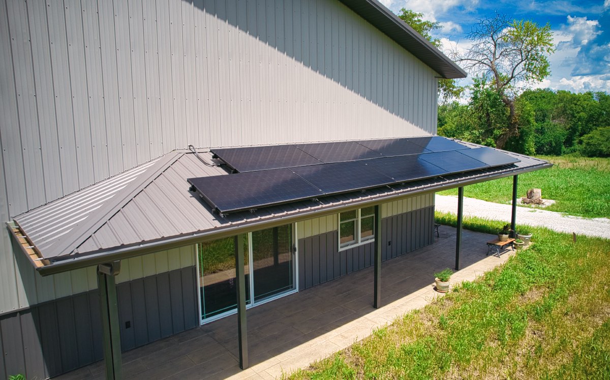 The owner of this Lawrence barndominium wanted to make a positive change to their carbon footprint and save money on their monthly electricity bills by having Good Energy Solutions design and install 13 Maxeon solar panels on the awning of their property.