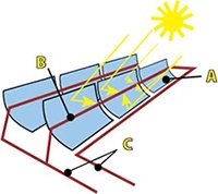 A) The sun’s rays reflect off the parabolic trough which concentrates the sun’s energy onto a centrally located receiver tube.