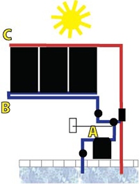 A) Using the existing pool pump, pool water is directed through a series of valves to the solar collectors.